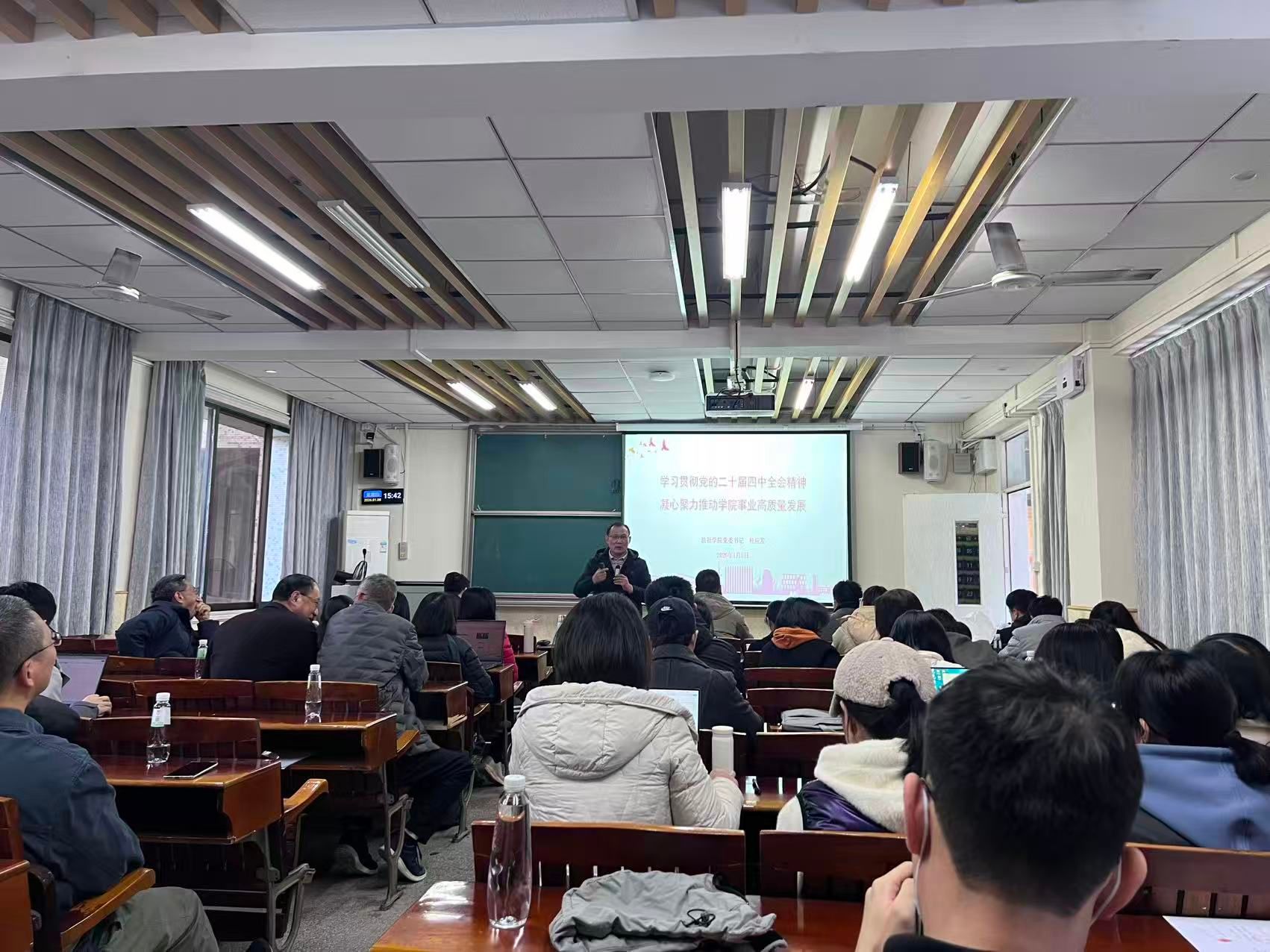 最后,杜应发强调,学习贯彻好党的二十届四中全会精神,是当前和今后一个时期的重大政治任务,全院教职工一是要深入学习宣传贯彻党的二十届四中全会精神,深刻把握全会的核心要义、丰富内涵和实践要求。二是要将全会精神融入教育教学全过程。通过专题教学、案例分析等方式,向学生讲清楚全会的重大意义和主要内容,将全会精神融入课程思政建设。三是要加强理论研究和阐释,聚焦全会提出的重要思想观点、重大战略部署,特别是在法治建设、知识产权保护、社会治理等方面,开展深入的理论研究和阐释工作,形成一批有深度、有分量的科研成果。四是要立足岗位实际,推动工作落实。要深化教育教学改革,提高人才培养质量;聚焦国家战略需求,加强科学研究和成果转化等,以实际行动贯彻落实全会精神。